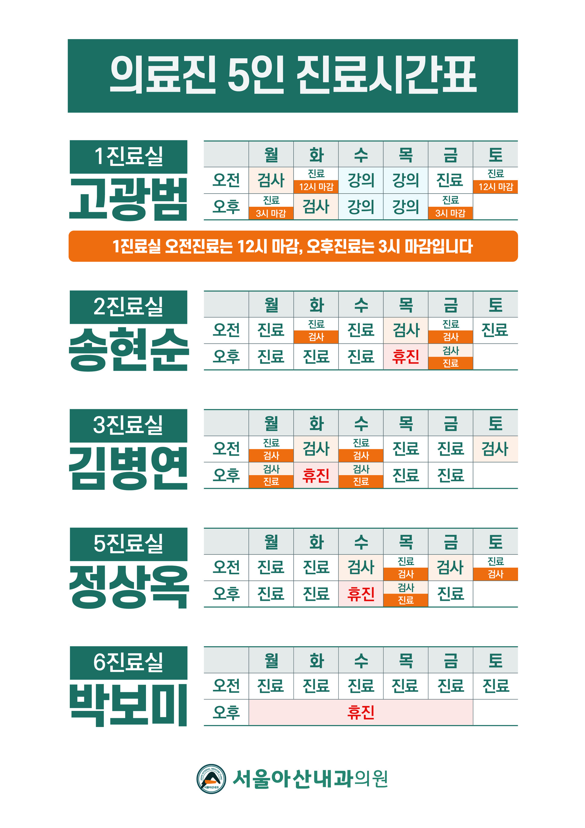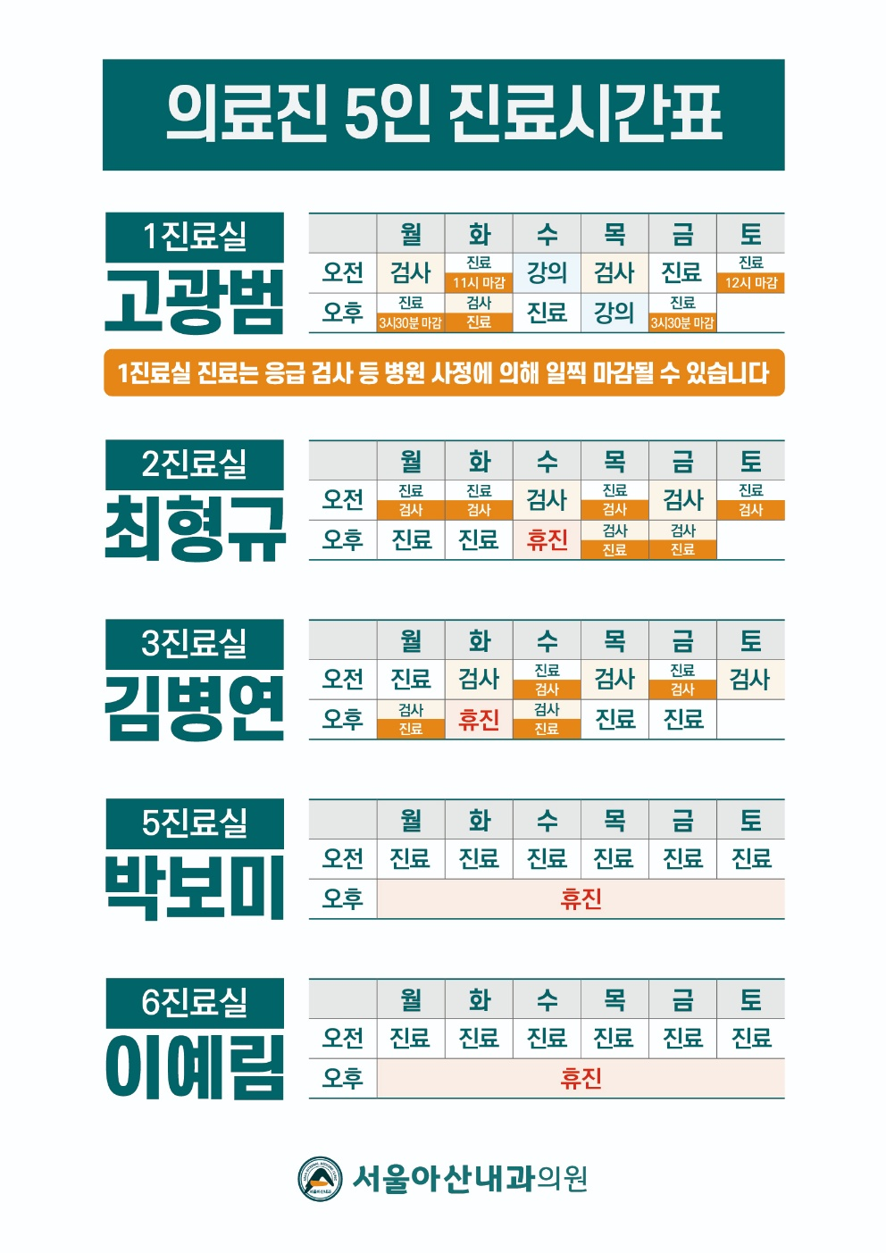 서울아산내과 진료실별 진료시간 안내